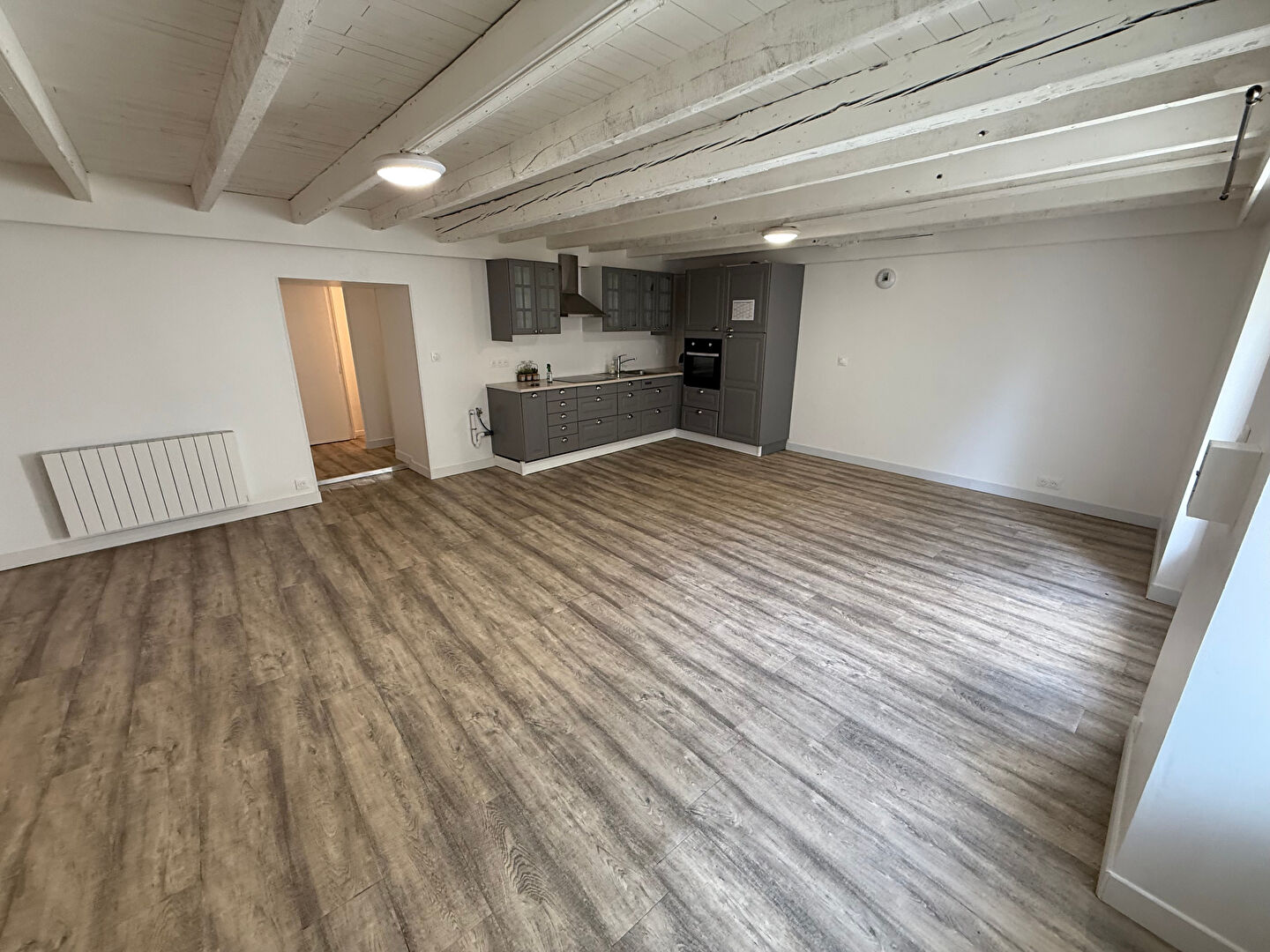 Une entrée dans la pièce de vie avec cuisine ouverte aménagée et équipée ( hotte, plaque, four, réfrigérateur), un dégagement avec placard, WC indépendants, buanderie.