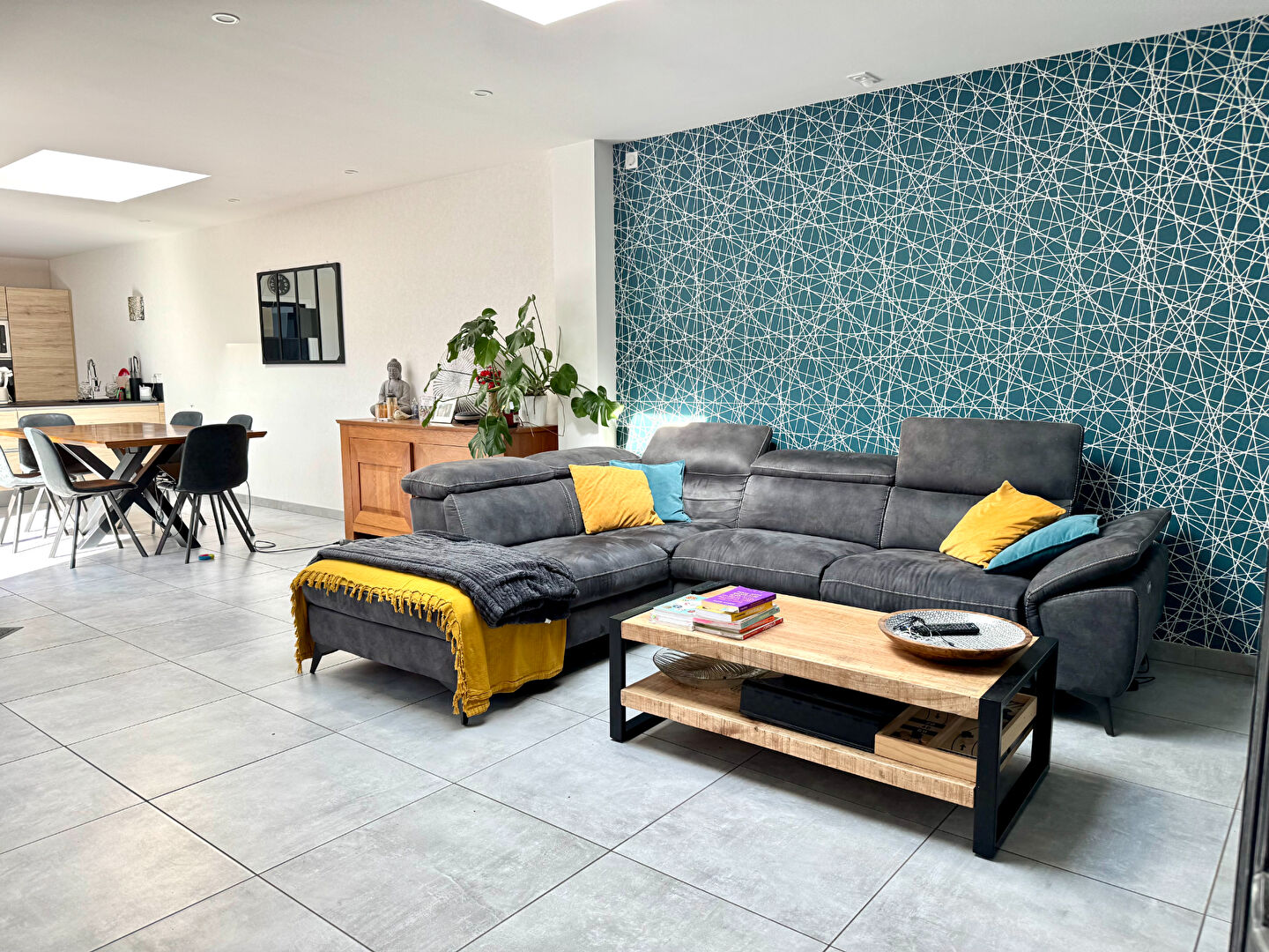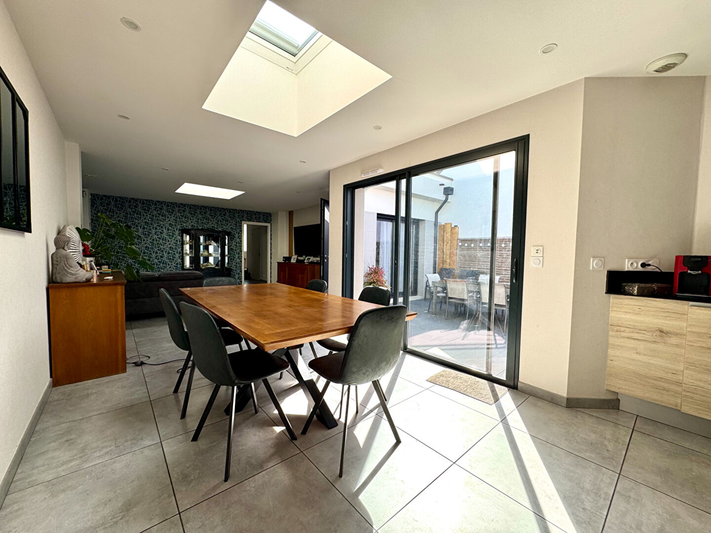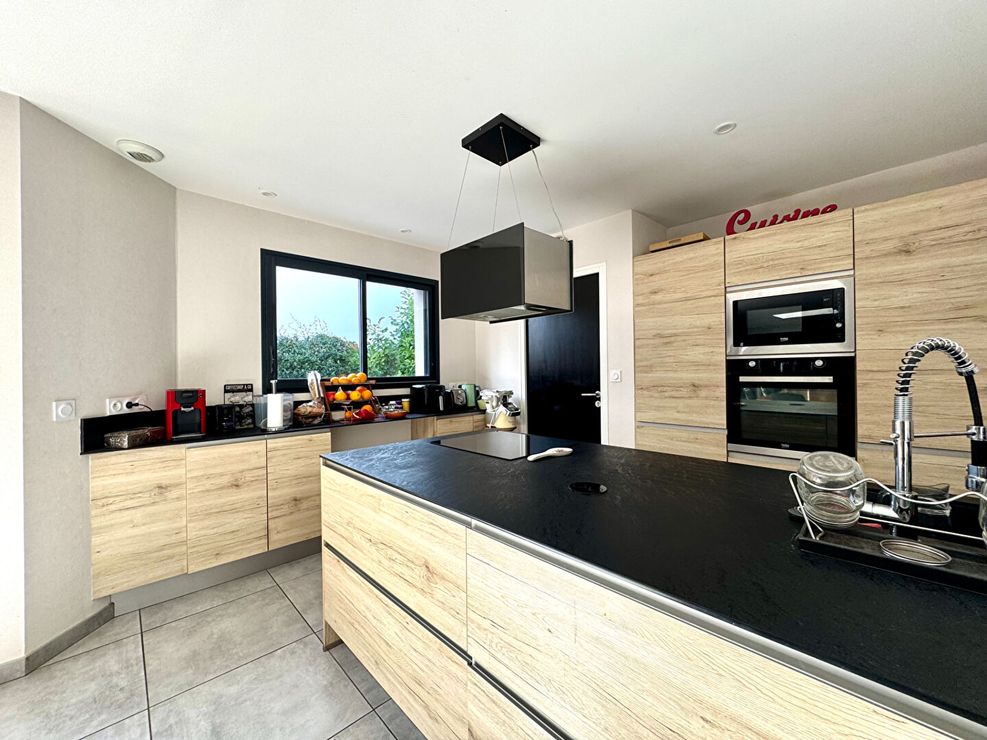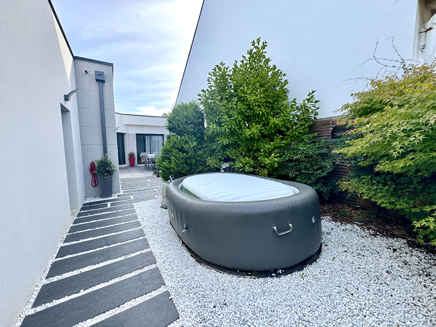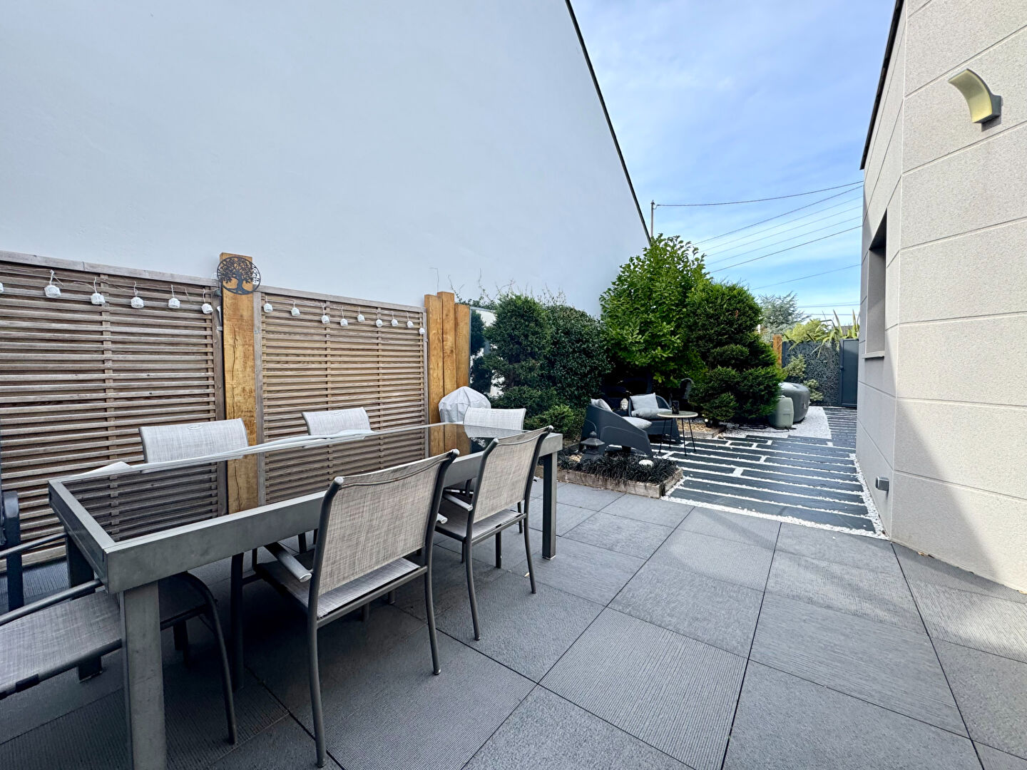 Cette maison comprend : un bel espace de vie exposé SUD avec séjour et cuisine ouverte entièrement aménagée et équipée, le tout donnant sur une terrasse extérieure sans vis-à-vis, 4 chambres dont une suite parentale avec un dressing et une salle d’eau, une salle de bain supplémentaire avec WC, des WC séparés ainsi qu’un garage attenant. Deux des chambres bénéficient d’un jardin privé à l’arrière de la maison.