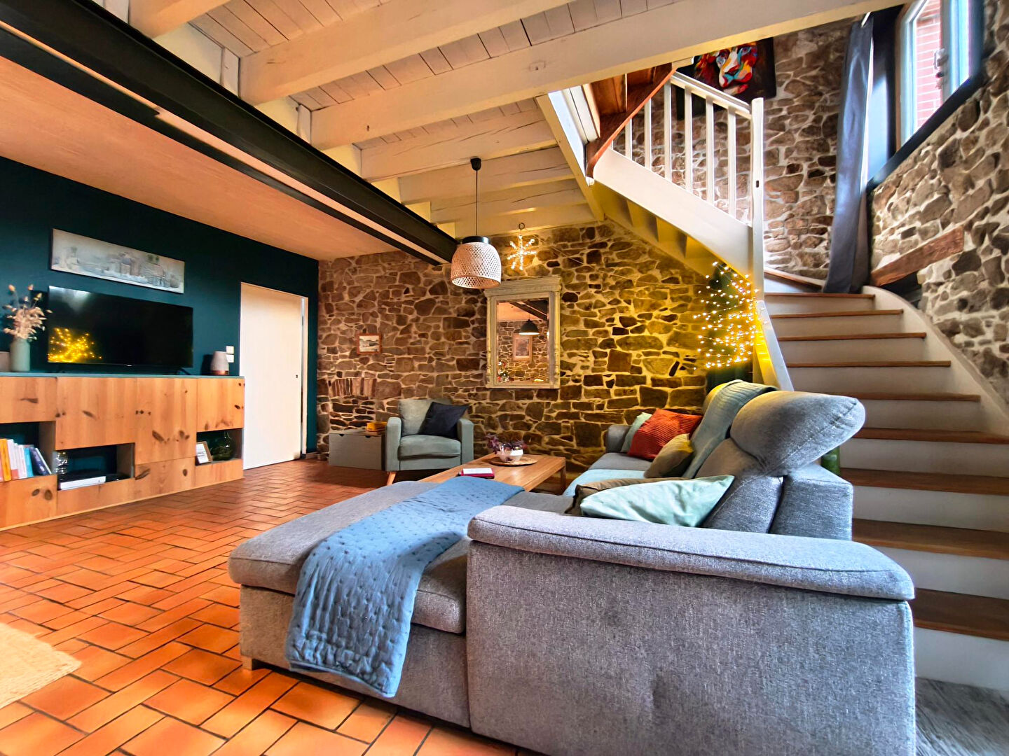Dès l’entrée, vous découvrirez un espace accueillant avec WC, menant à une superbe pièce de vie séjour / salle à manger. Les murs en pierre apparente, la belle hauteur sous plafond et la luminosité généreuse confèrent à cet espace un charme incomparable.